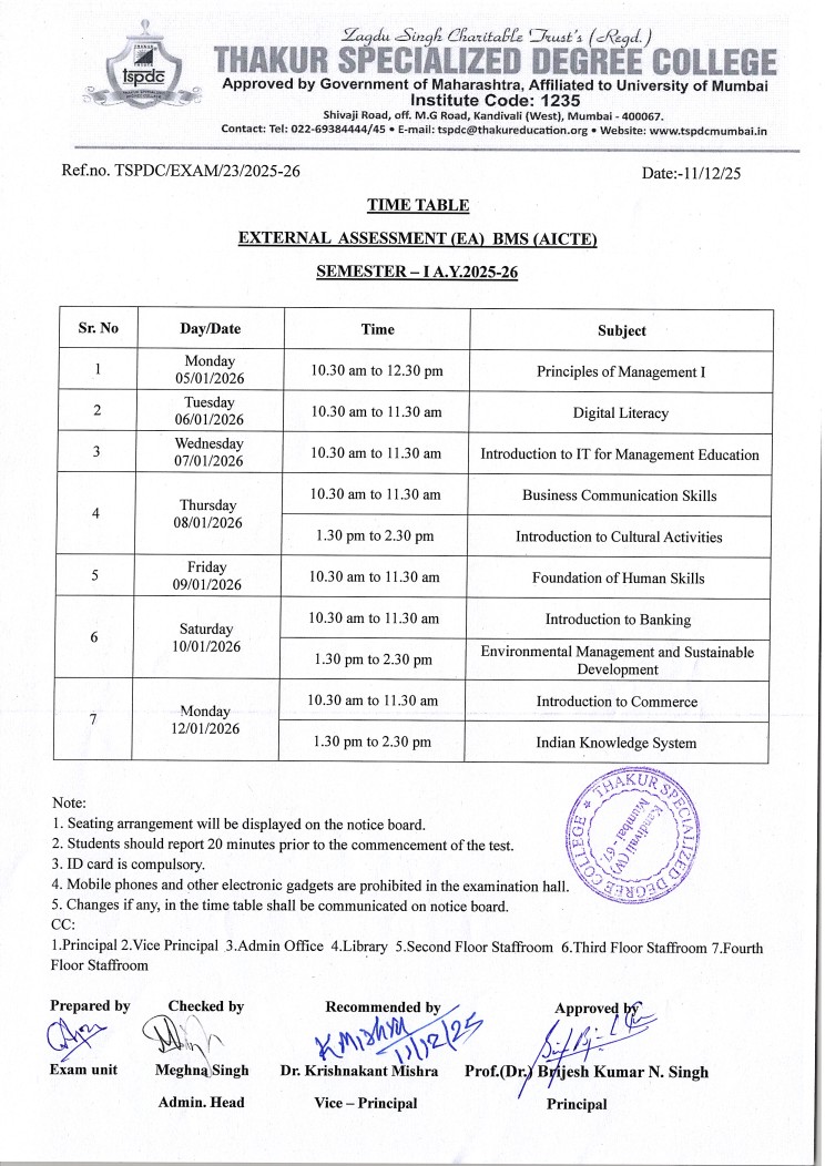 - Time Table of External Assessment ATKT Semester – I A.Y 2024-25 B.M.S