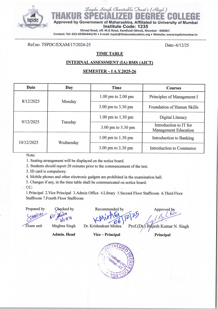 - Time Table of Internal Assessment Semester – I A.Y 2024-25 B.M.S