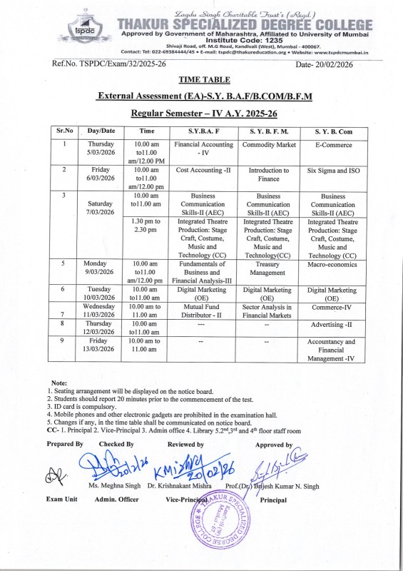 - Time Table of External Assessment Semester – IV A.Y 2024-25 S.Y.B.Com, S.Y.B.Sc, S.Y.B.A