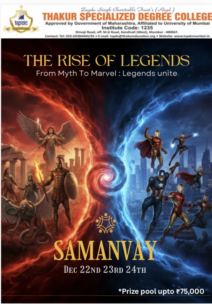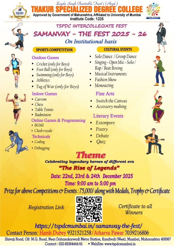 Samanvay-The Fest Samanvay - The Fest 2025 Registration Form Samanvay - The Fest on 22nd, 23rd, and 24th December 2025 First Name *Last Name *Contact Number *Email Address *College ID Photo *Choose FileNo file chosenDelete uploaded fileCollege CC code *Payment Screenshot Upload *Choose FileNo file chosenDelete uploaded fileSports CompetitionGamesIndoorCarromChessTable TennisBadminton (Singles)Badminton (Doubles)Online Games (BGMI)Online Games - Clash of RoyaleLogic BuildingOnline Games - DebuggingOutdoorFootballSwimmingAthletics-Racing (200m) (bhaag milka bhaag)Tug of WarCricket Participant DetailsNameNameNameNameNameNameNameNameNameAdd participantsRemove participantsCarrom Participant DetailsNameNameAdd participantsRemove participantsBadminton (Doubles) Participant DetailsNameNameAdd participantsRemove participantsDebugging Participant DetailsNameNameAdd participantsRemove participantsBGMI Participant DetailsNameNameNameNameAdd participantsRemove participantsFootball Participant DetailsNameNameNameNameNameNameNameNameNameAdd participantsRemove participantsLogic Building Participant DetailsNameNameAdd participantsRemove participantsTug of war Participant DetailsNameNameNameNameNameNameNameAdd participantsRemove participantsCultural EventsTheme : The Rise of LegendsDance (Solo)Dance (Group)Open Mic - SingingOpen Mic - RapOpen Mic - BeatboxingMusical InstrumentsFashion ShowDramaAccessory MakingDebateCanvas PaintingQuizExtemporePoetryDance Group Participant DetailsNameNameNameNameNameNameNameNameNameNameAdd participantsRemove participantsCanvas Painting Participant DetailsNameNameAdd participantsRemove participantsFashion Show Participant DetailsNameNameNameNameNameNameNameNameNameNameAdd participantsRemove participantsOpen Mic - Singing Participant DetailsNameNameAdd participantsRemove participantsDebate Participant DetailsNameNameAdd participantsRemove participantsOpen Mic - Rap Participant DetailsNameNameAdd participantsRemove participantsCanvas Painting Participant DetailsNameNameAdd participantsRemove participantsOpen Mic - Beatboxing Participant DetailsNameAdd participantsRemove participantsTotal Amount PayableRs.I’ve made the payment as shown above through the QR code shared below.. Consent *I have shared the payment screenshot on the number 8767614849.Consent *I have read the brochureRegisterPlease do not fill in this field. Click to view or download the brochure containing the Rules and Regulations for Samanvay Event.